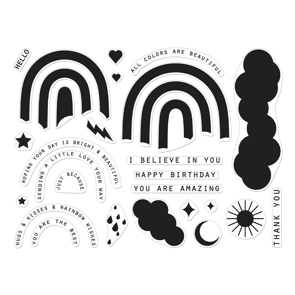 While that's drying I die-cut the Delicate Butterfly Fancy Die with Black Glitter and Vellum Paper. I also stamp the sentiment from Rainbow HeroScape onto Pitch Black cardstock with Embossing & Watermark ink and heat-emboss it with Gold Embossing Powder before trimming it down to a thin label. I use Precision Liquid Glue to adhere the center of the butterflies to the panel and then carefully fold up their wings to create a little dimension. I finish the panel by adding the sentiment with foam mounting tape.