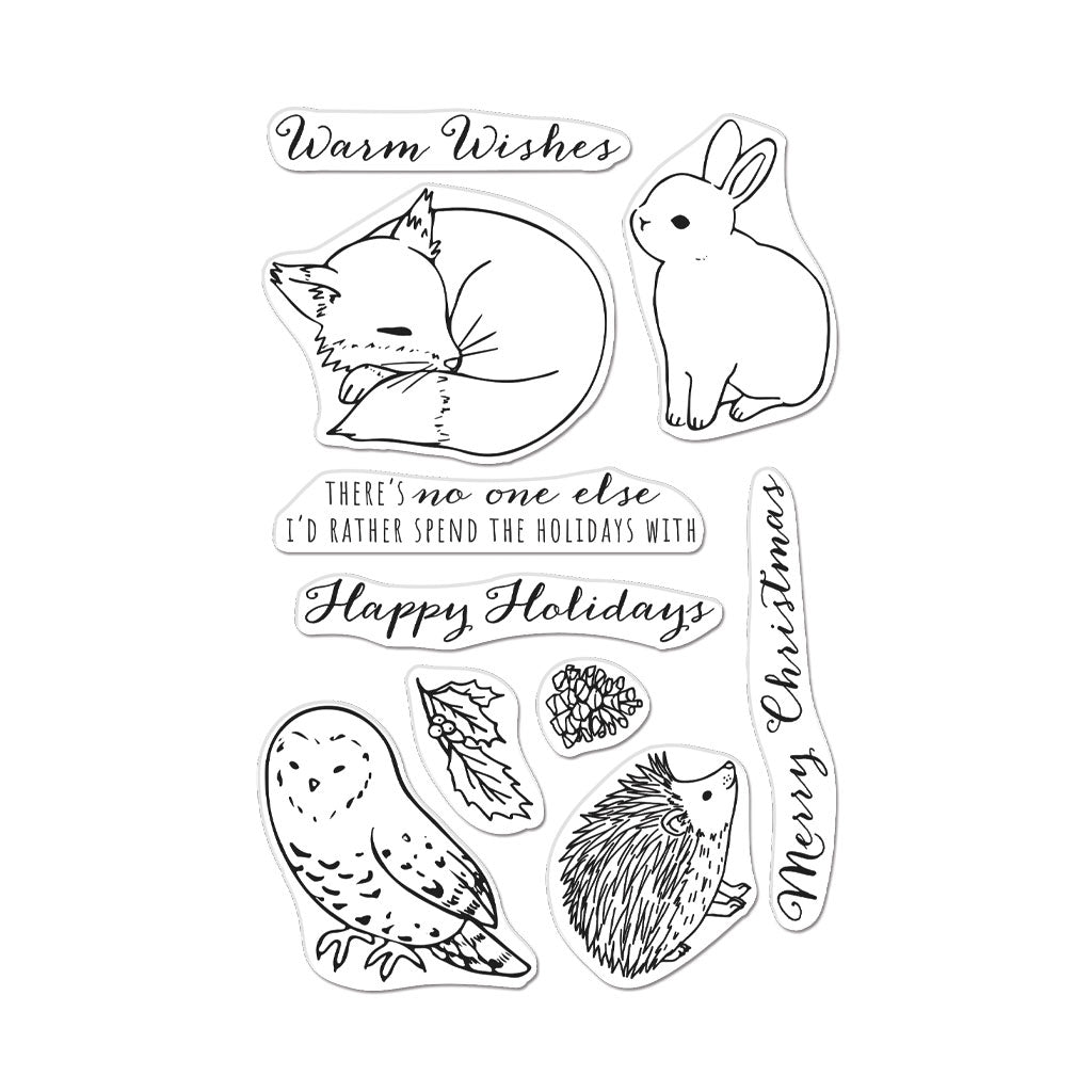 Featuring a cozy fox, rabbit, hedgehog, and owl, this charming set includes a pinecone and greenery spray as well as four wintry sentiments.