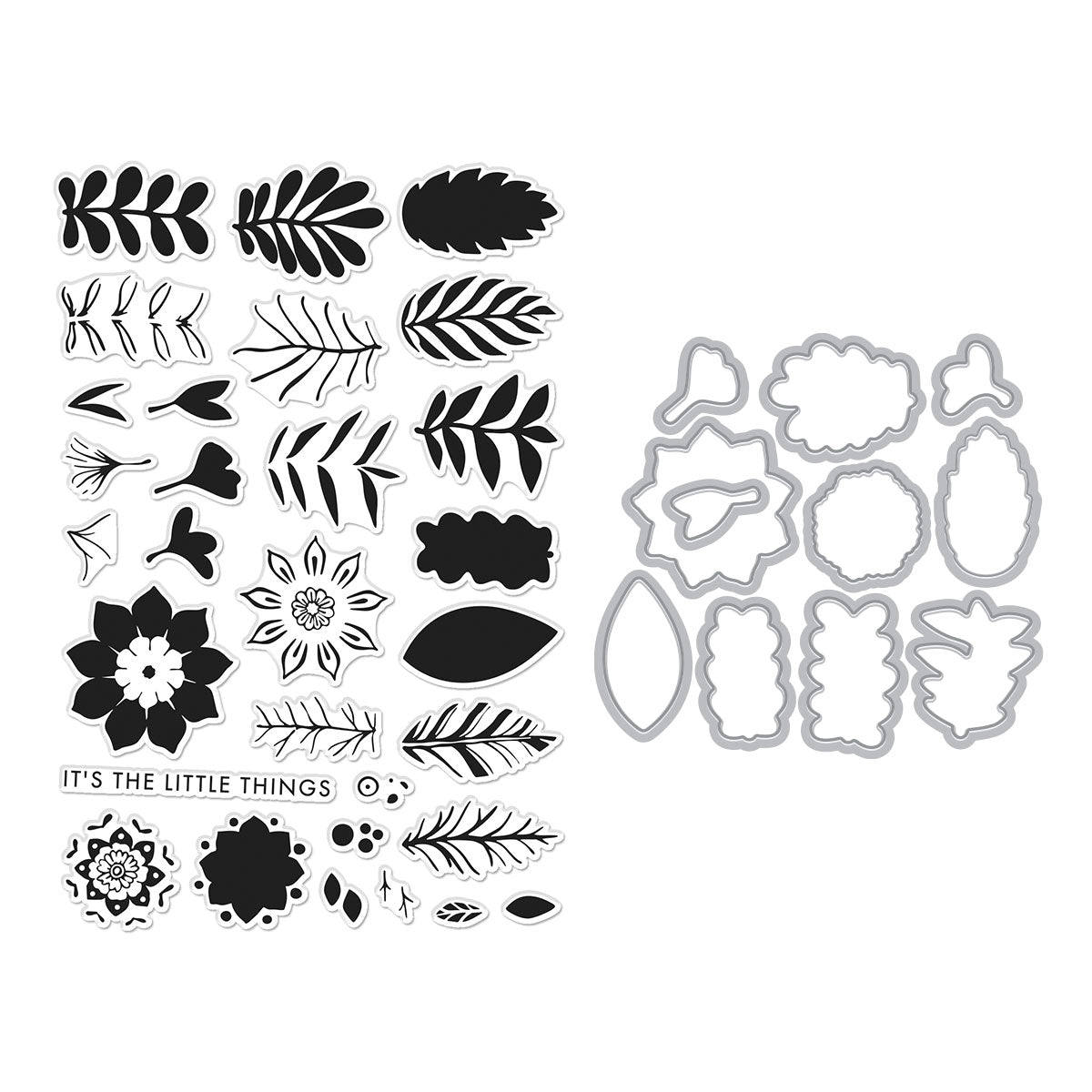 The Color Layering Rainforest Leaves - Stamp & Cut of the Month features a premium quality clear stamp set with matching Frame Cuts, original and exclusive to April 2025. This clear stamp and die set lets you create lush, multi-layered botanical scenes with vibrant flowers, playful leaves, and heartfelt sentiment, "It's the little things."