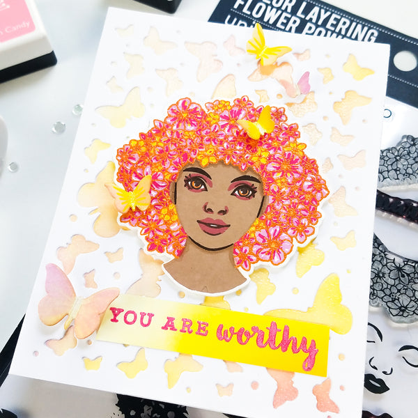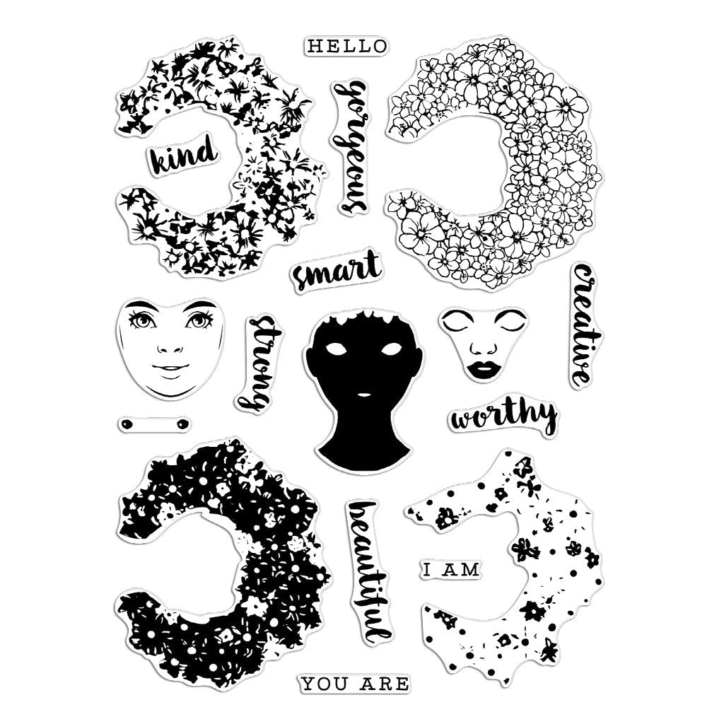 This 6" x 8" clear stamp set includes layered floral elements to create dynamic hair-like textures, alongside empowering words and customizable facial details. Pair the stamps to create bold, statement pieces or subtle, layered backgrounds. Ideal for techniques like heat embossing, coloring, and ink blending, this set is perfect for creating one-of-a-kind artwork that celebrates creativity and confidence.