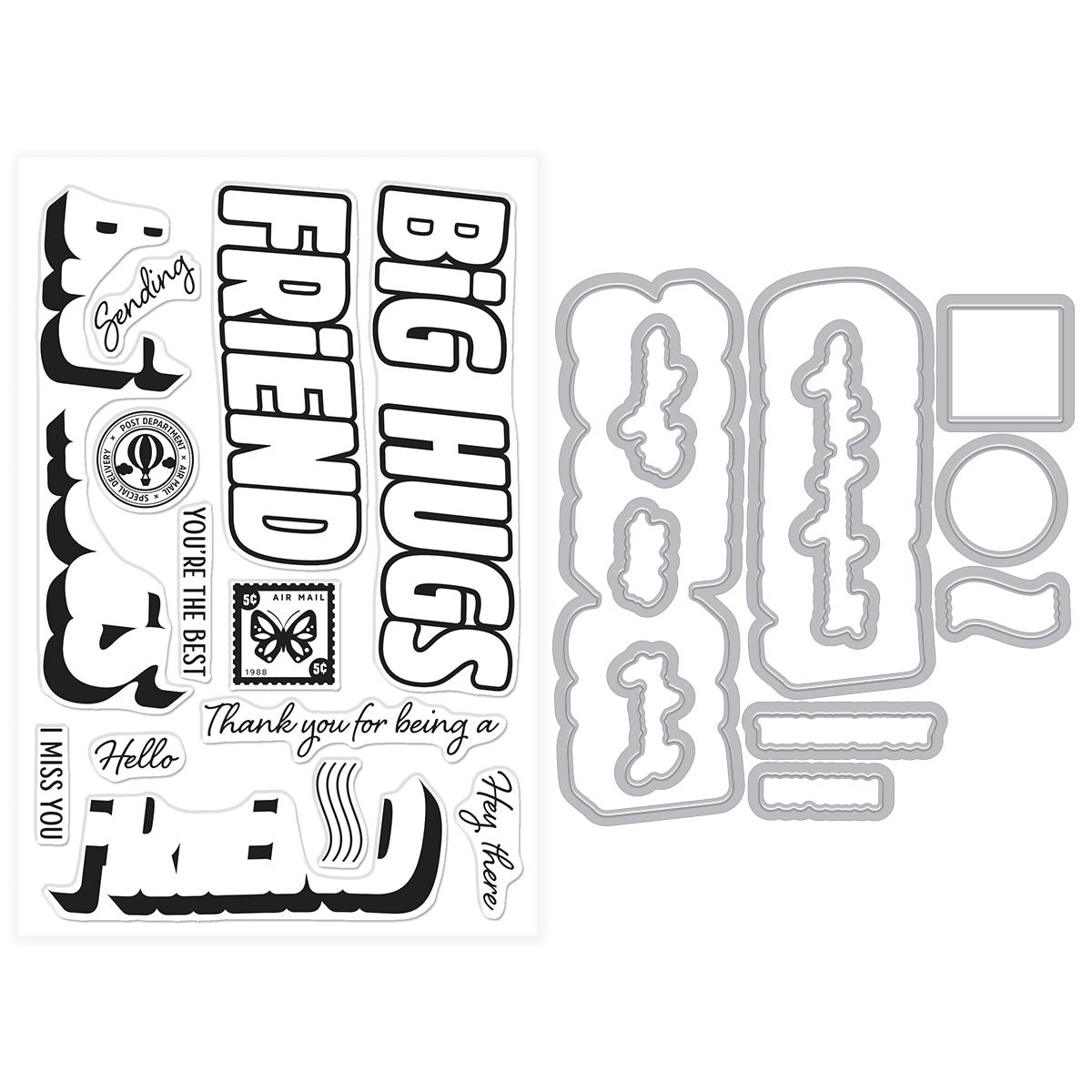 he set features large layered words like “BIG HUGS” and “FRIEND,” script accents like “Sending” and “Thank you for being a,” plus fun mail-inspired icons such as a postmark and faux postage stamp.