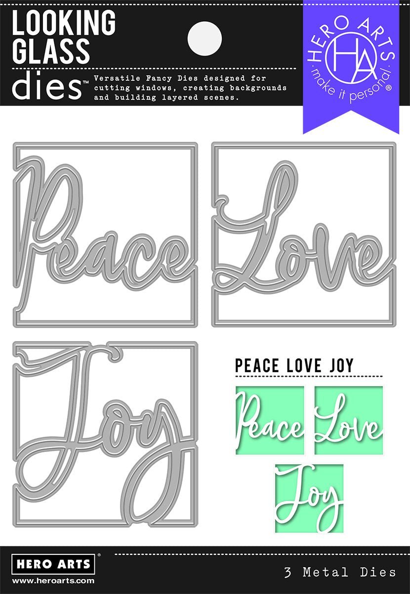A Looking Glass die set featuring script words of "peace", "love", and "joy". Layer or use individually for a variety of effects.