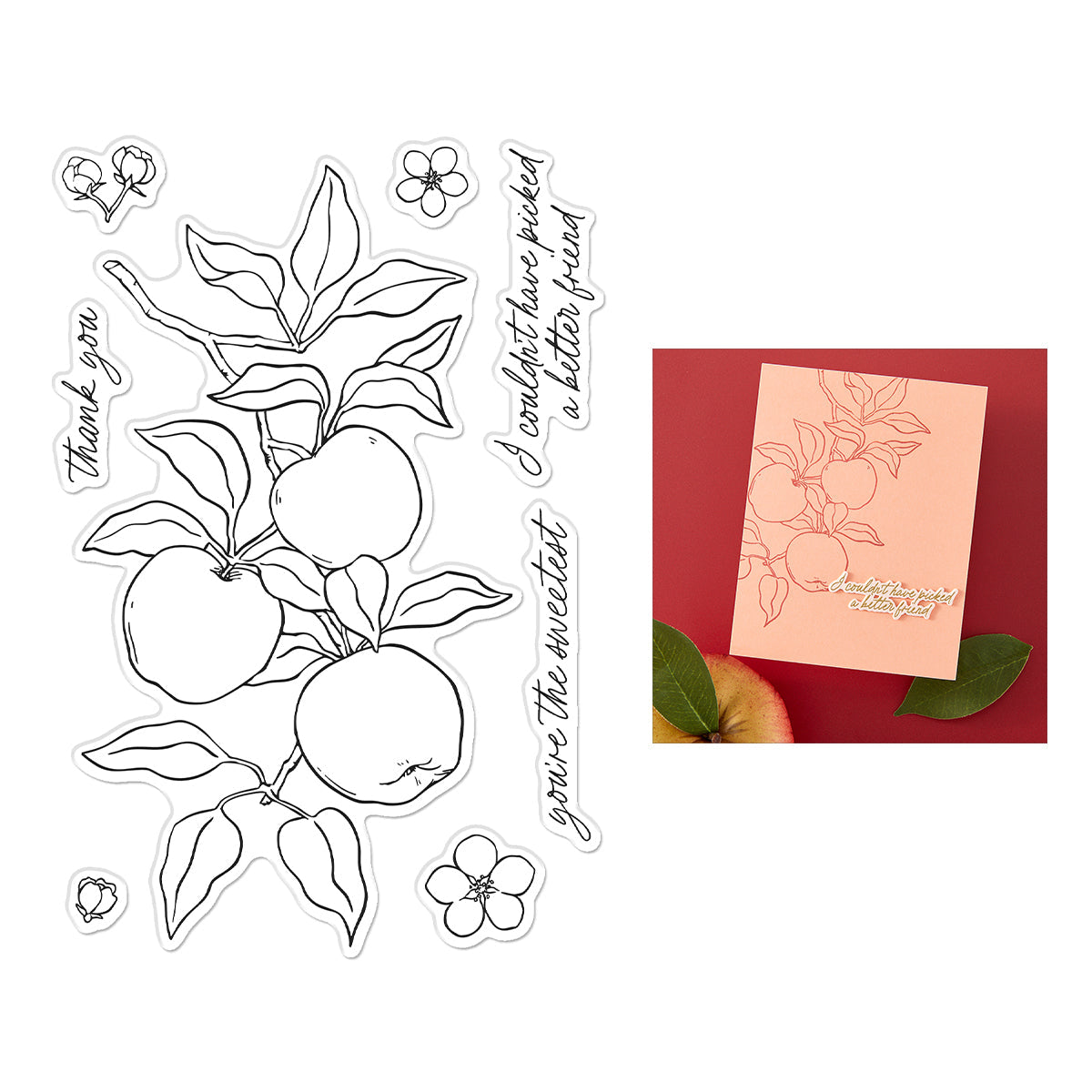 The Apple Branch Clear Stamp Set, from the I Pick You Collection, features a beautiful fine line illustration of an apple branch with three ripe apples and lush leaves, accompanied by delicate blossoms. The set also includes elegant handwritten sentiments such as “thank you,” “you’re the sweetest,” and “I couldn’t have picked a better friend," making it perfect for expressing gratitude and friendship in your craft projects.