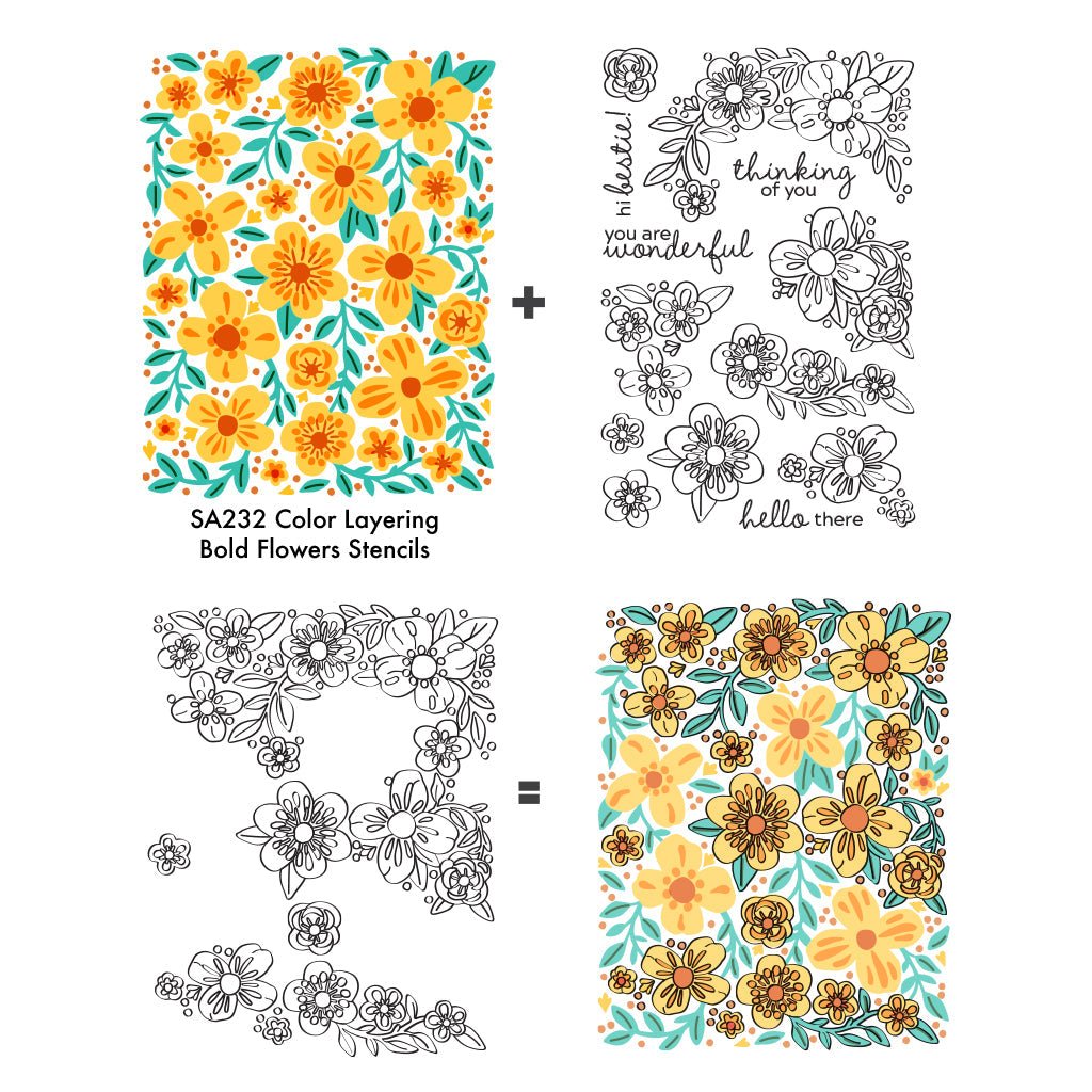 This beautiful floral set includes eight images of various flower clusters and four everyday sentiment stamps. Use alone, or pair with coordinating SA232 Color Layering Bold Flowers Stencils.