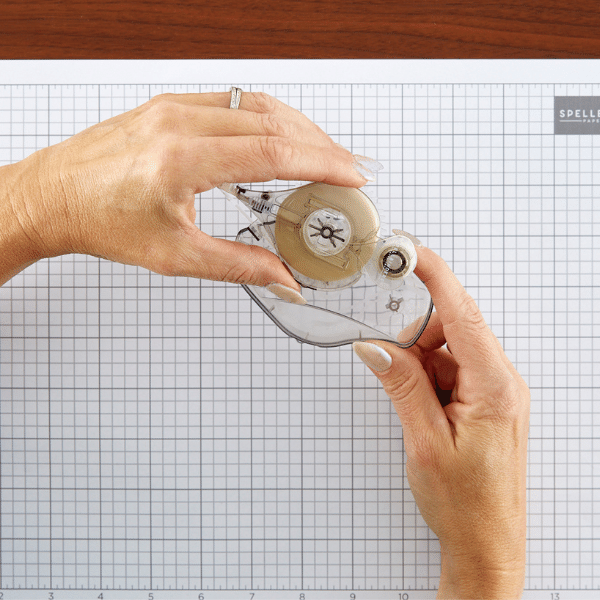 The tape runner refill is a drop-in cartridge filled with 49ft/15 meters of thin 1/8-inch white double-sided adhesive strips. To refill, separate casing by pushing thumbs into tab at bottom and lift off top. Remove used cartridge, align refill with case, and replace cover.