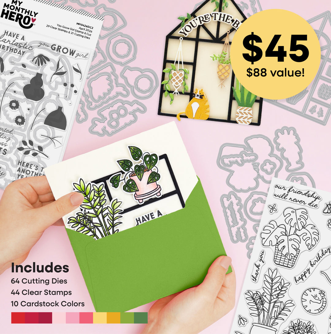My Monthly Hero is a curated cardmaking experience delivered to your door each month, filled with fresh inspiration, thoughtfully designed stamps and dies, and incredible value. It’s the joy of opening a package, clearing your desk, and creating handmade cards that brighten someone’s day — including your own.
