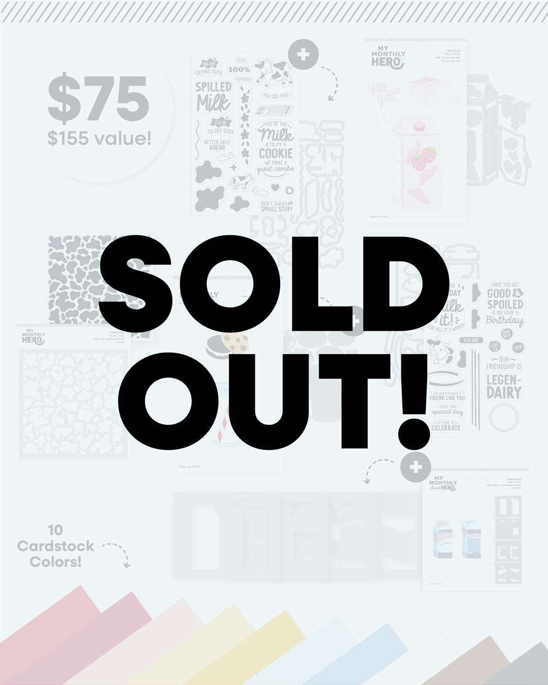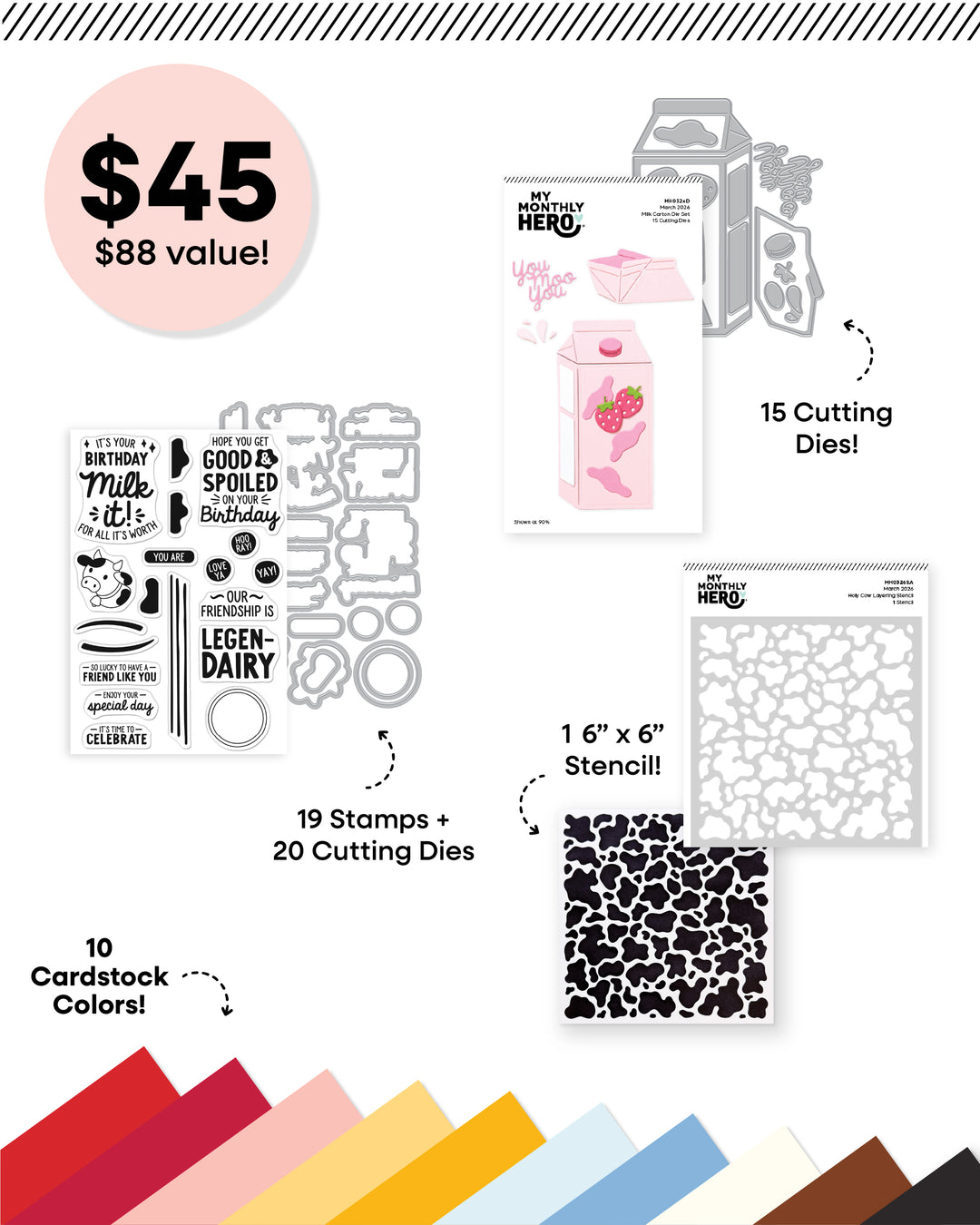 March's My Monthly Super Hero kit, Milk It, includes everything in the My Monthly Hero kit, plus more! My Monthly Super Hero is a monthly subscription that builds on the designs of the My Monthly Hero Kit, with additional dies, stamps and stencils for even more creative possibilities.
