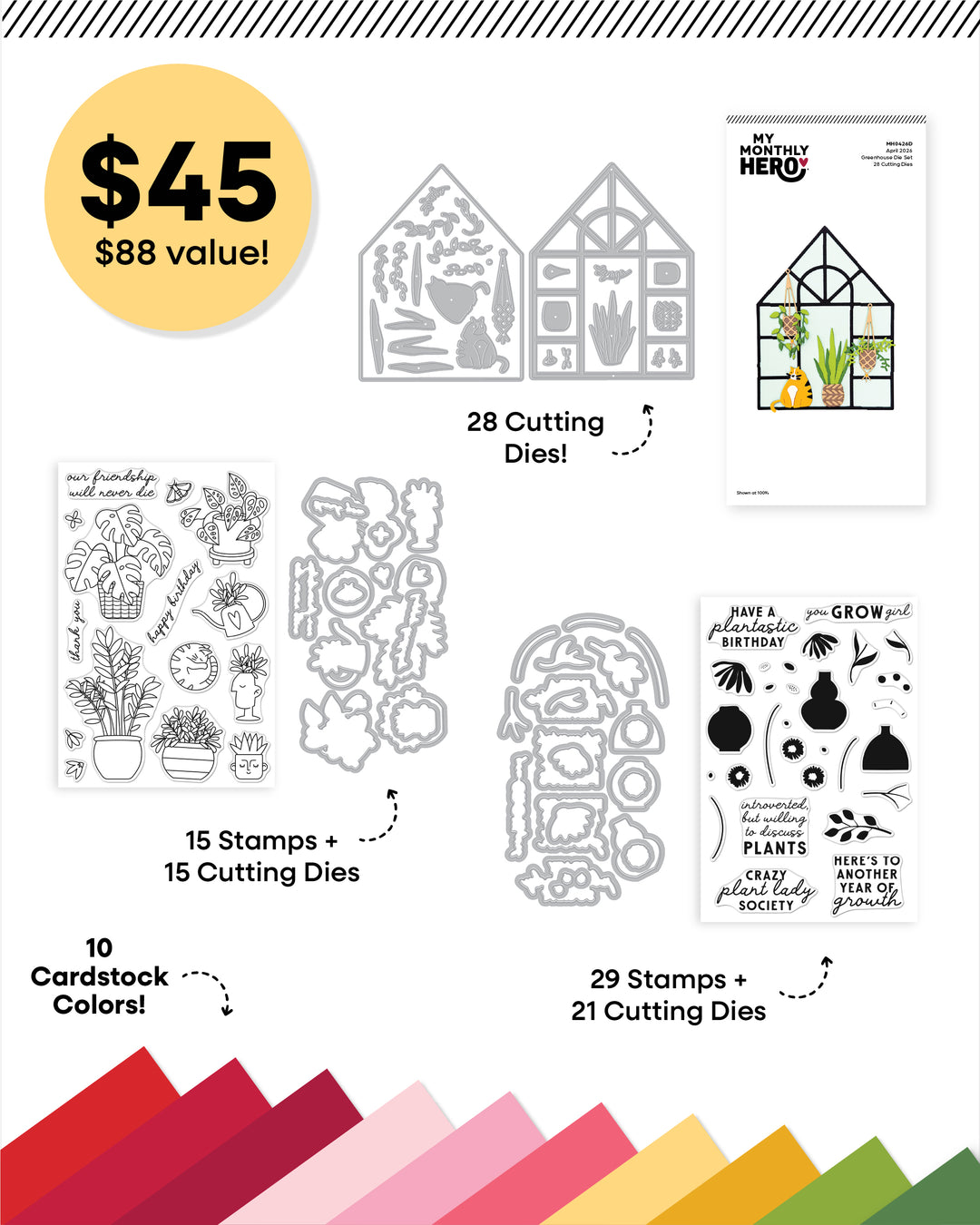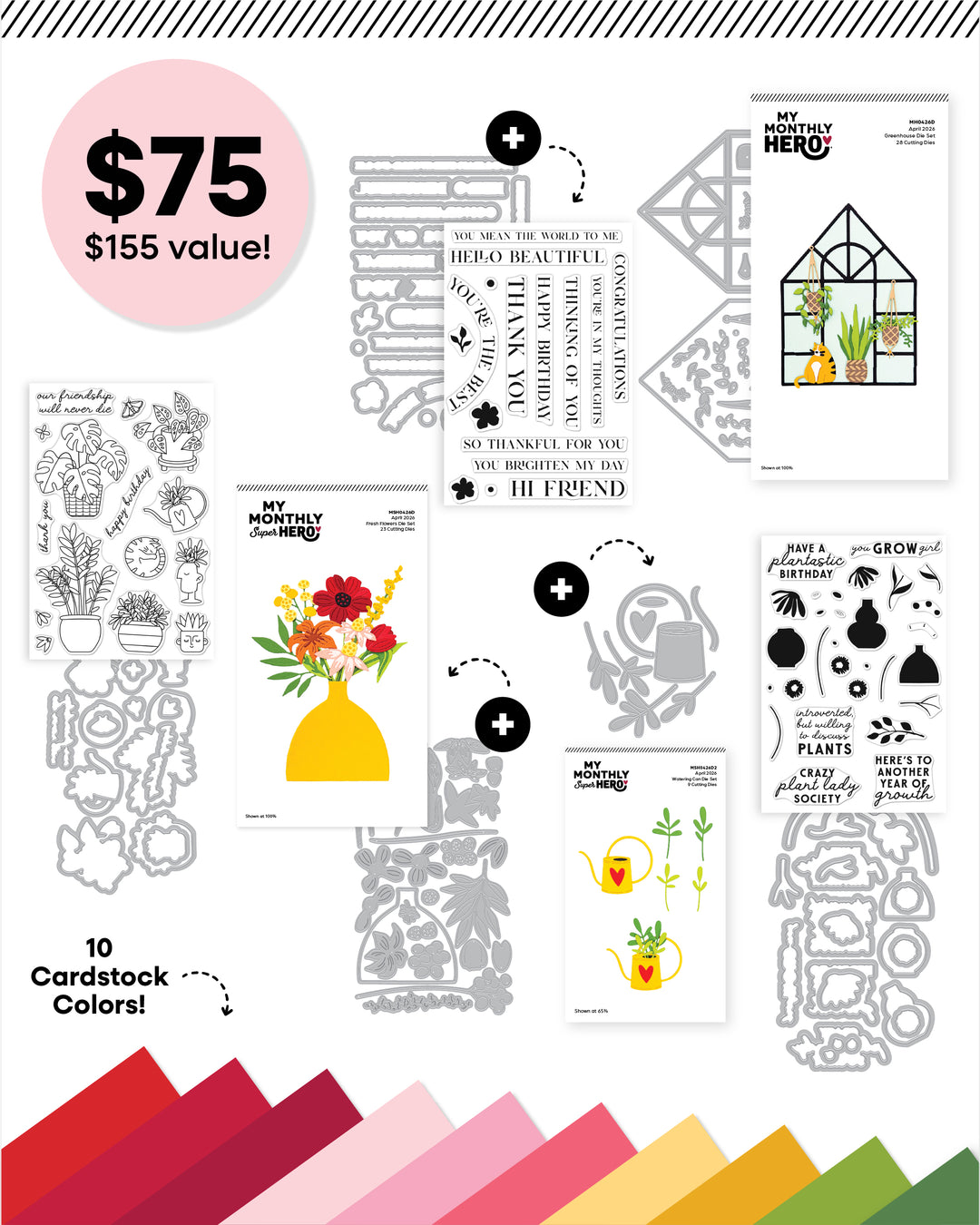 April’s My Monthly Super Hero kit, Plant Lady Society, includes everything in the My Monthly Hero kit — plus more! This expanded collection adds even more creative possibilities with additional stamps and dies designed to complement the plant-filled theme.