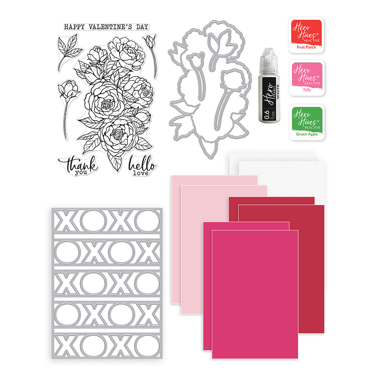 Hero Arts + Joann January 2023 Kit is a heartfelt collection perfect for Valentine’s Day and beyond. This romantic kit features a stunning floral clear stamp set, coordinating dies, a bold “XOXO” cover plate die, reactive ink cubes in a vibrant palette, Hero Pearls Ink in white, and an array of cardstock in sweet shades.