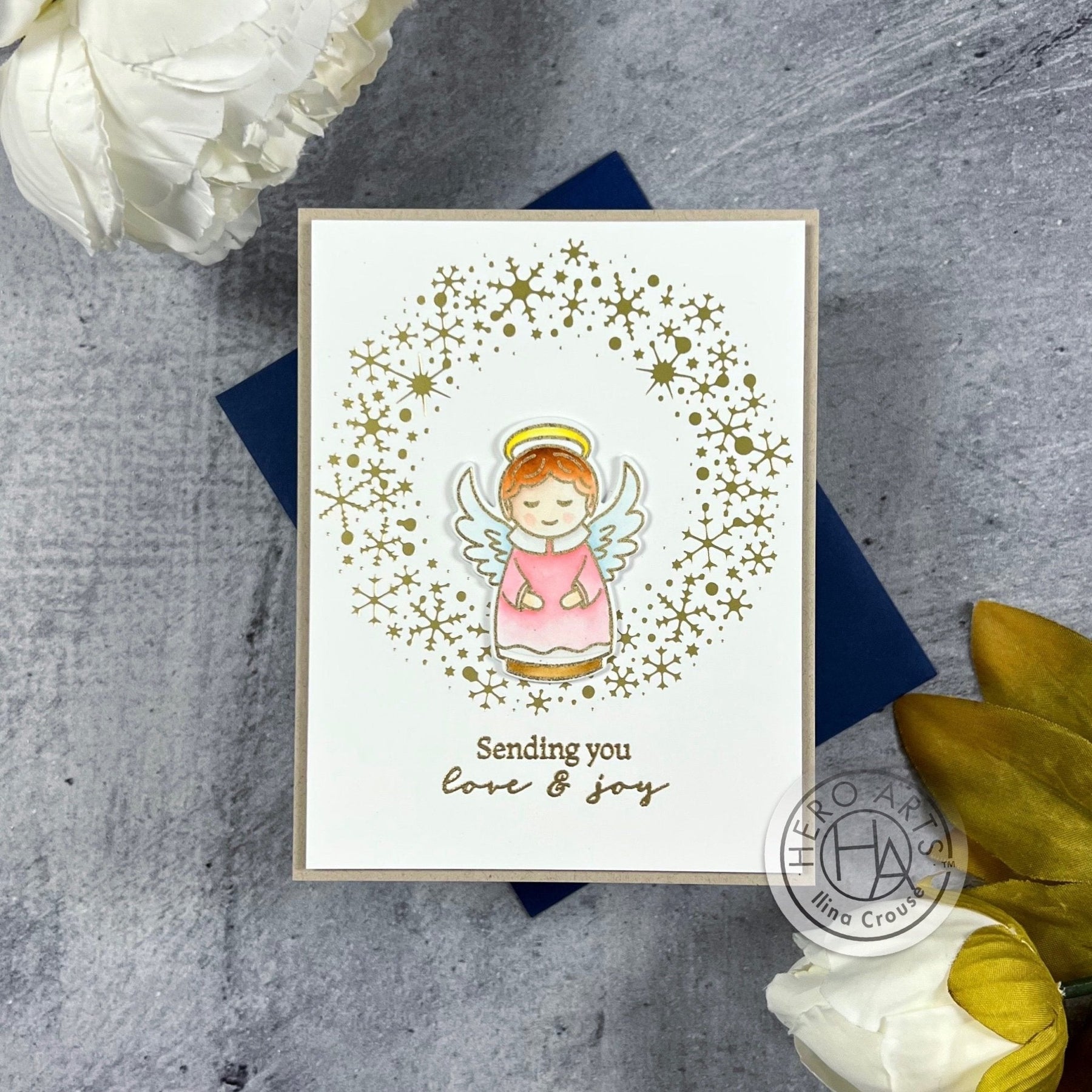 This gorgeous snowflake wreath makes mass-producing festive cards quick and easy. Use with your favorite sentiment for a stunning card, journal entry, mixed media project, or holiday decoration.