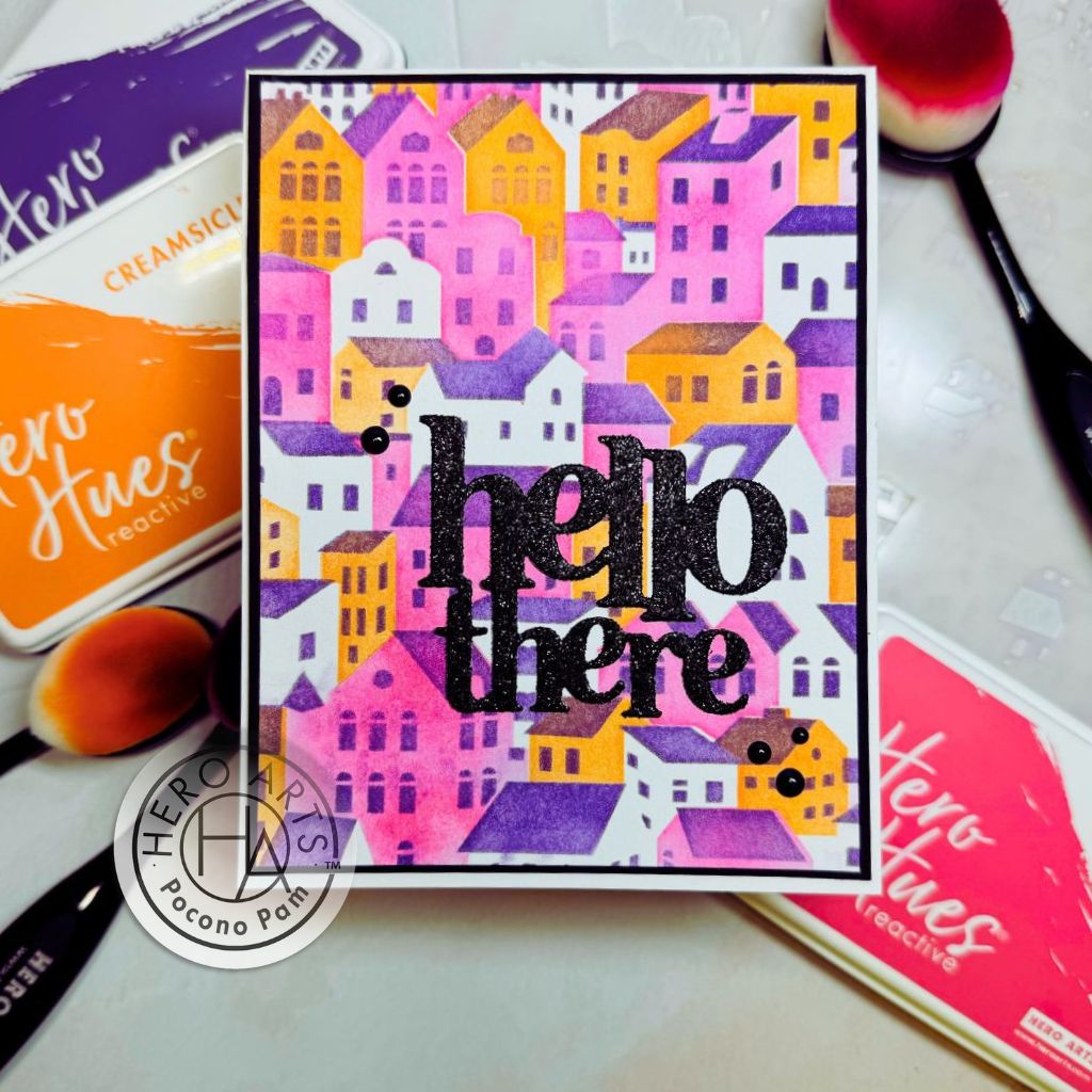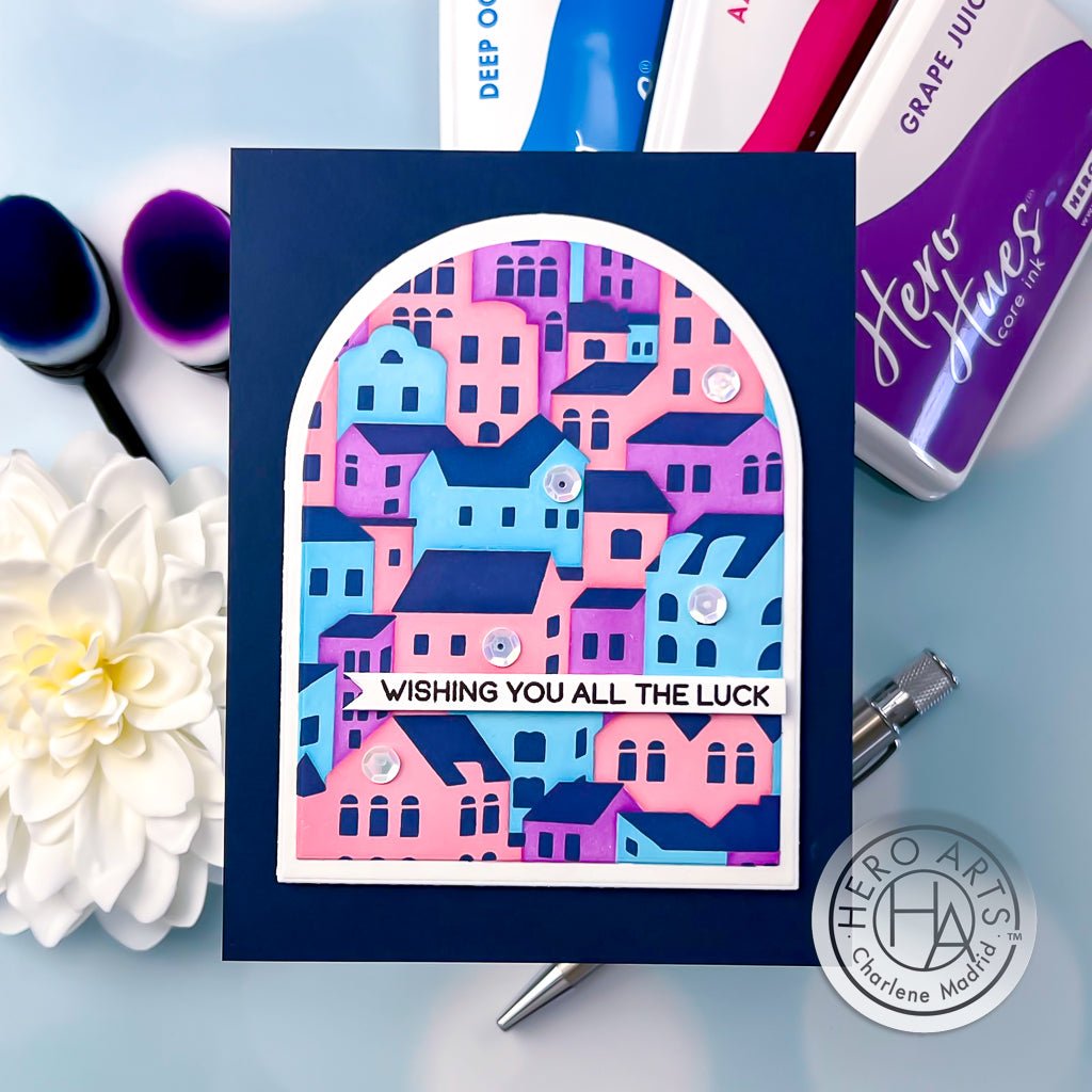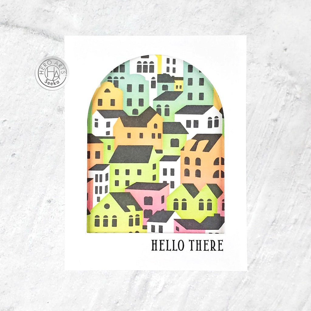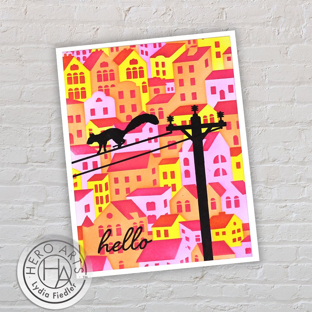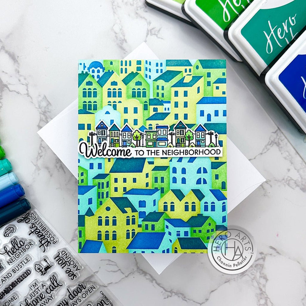 The Stacked Houses Layering Stencils of the Month, the exclusive stencils for June 2024 Hero Studio, allows you to create a charming background of stacked houses. Add depth and detail to your projects by layering different inks and mediums.