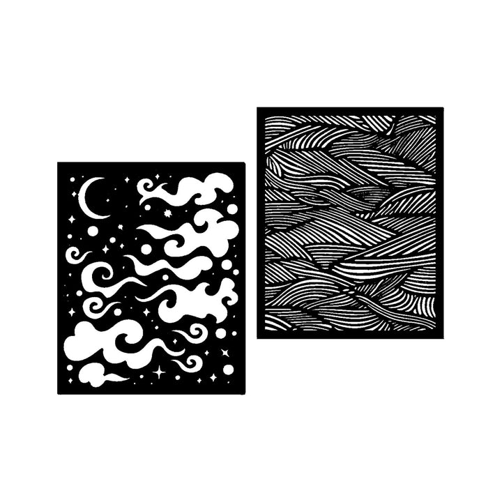 Sea & Sky Stencil Pair captures the beauty of nature with two coordinating designs—one evoking swirling nighttime skies with clouds, stars, and a crescent moon, and the other mimicking the flowing motion of ocean waves.